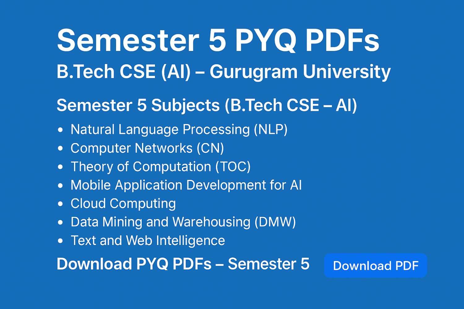 Download Semester 5 Previous Year Question Papers (PYQ) for B.Tech CSE (Artificial Intelligence) – Gurugram University. Includes PDFs for NLP, CN, TOC, Cloud Computing, Mobile Application Development for AI, DMW, and Text & Web Intelligence.